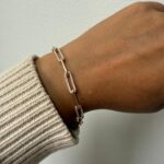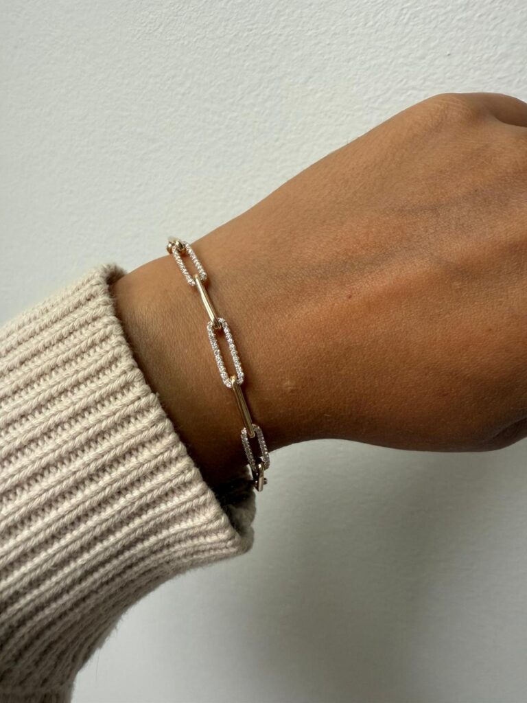 A meticulously crafted paperclip-link bracelet featuring elongated gold links alternating with pavé-set diamond connectors. The mix of sleek metal and shimmering stones creates a quietly opulent silhouette - modern, understated, and unmistakably luxurious. Designed to elevate any collection, it offers the kind of elegance that feels both effortless and enduring.
