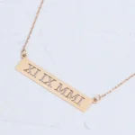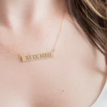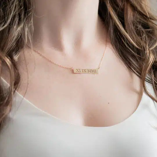 Mark your most perfect date forever in our punched out bars. Roman numerals reflect this timeless keepsake. Several different plate styles to choose from. 16” long chain with spring clasp. A perfect gift!